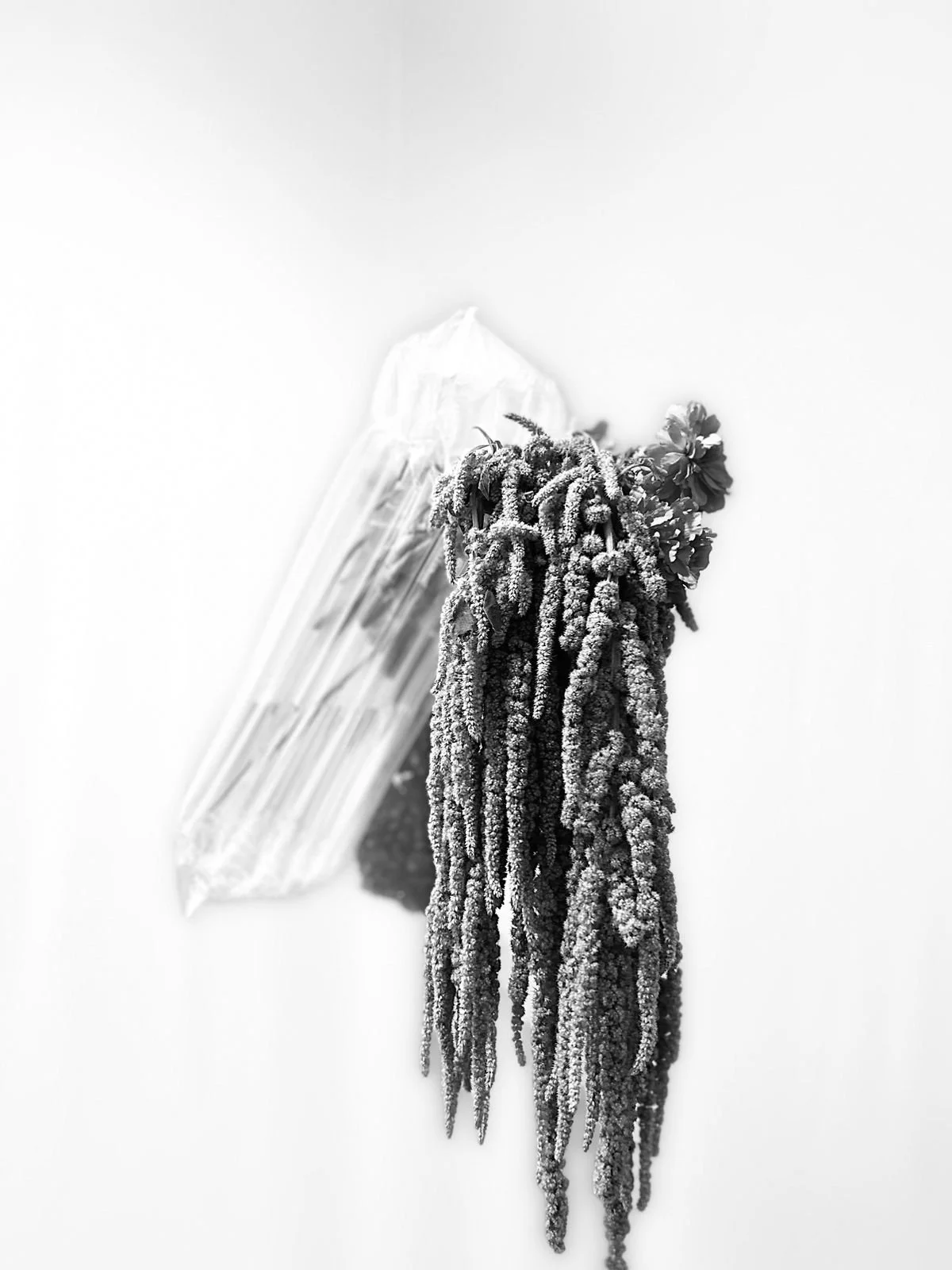 The transparent structure creates a play of shapes and textures, while the organic lines of the hanging amaranth contrast with the warm intensity of the petals.