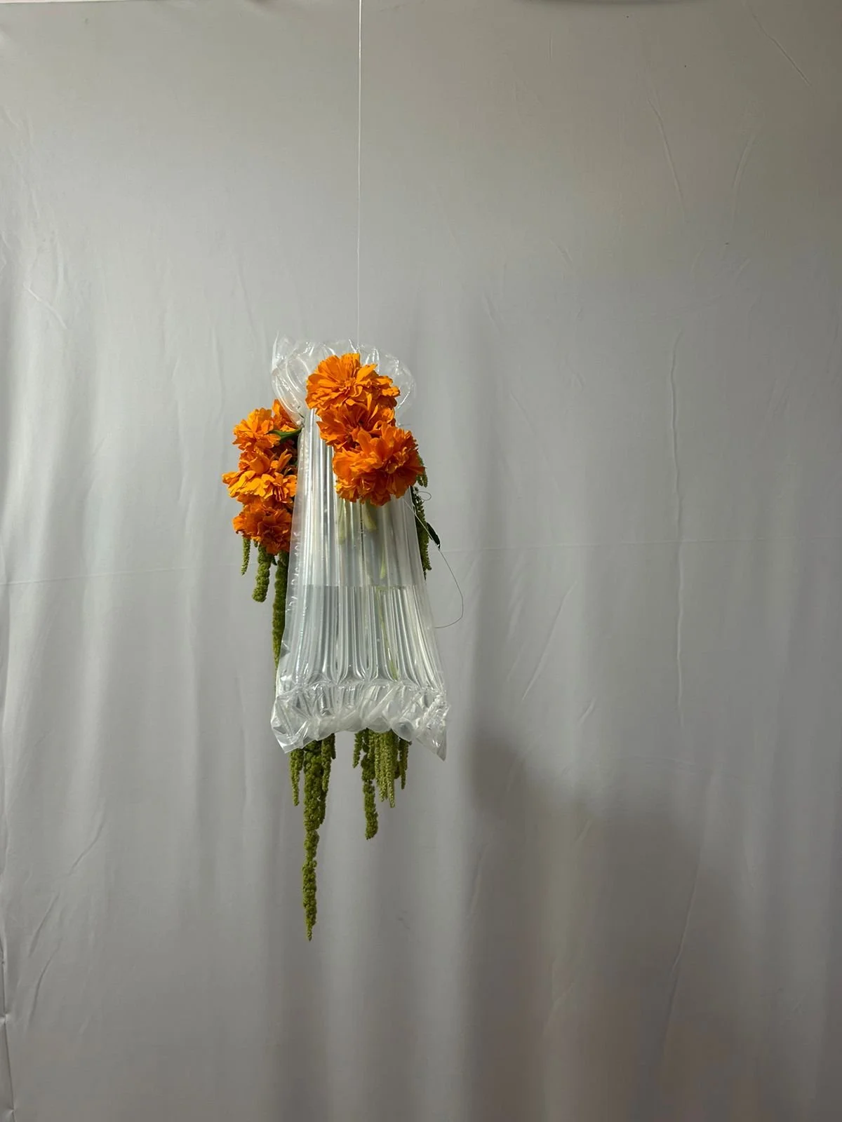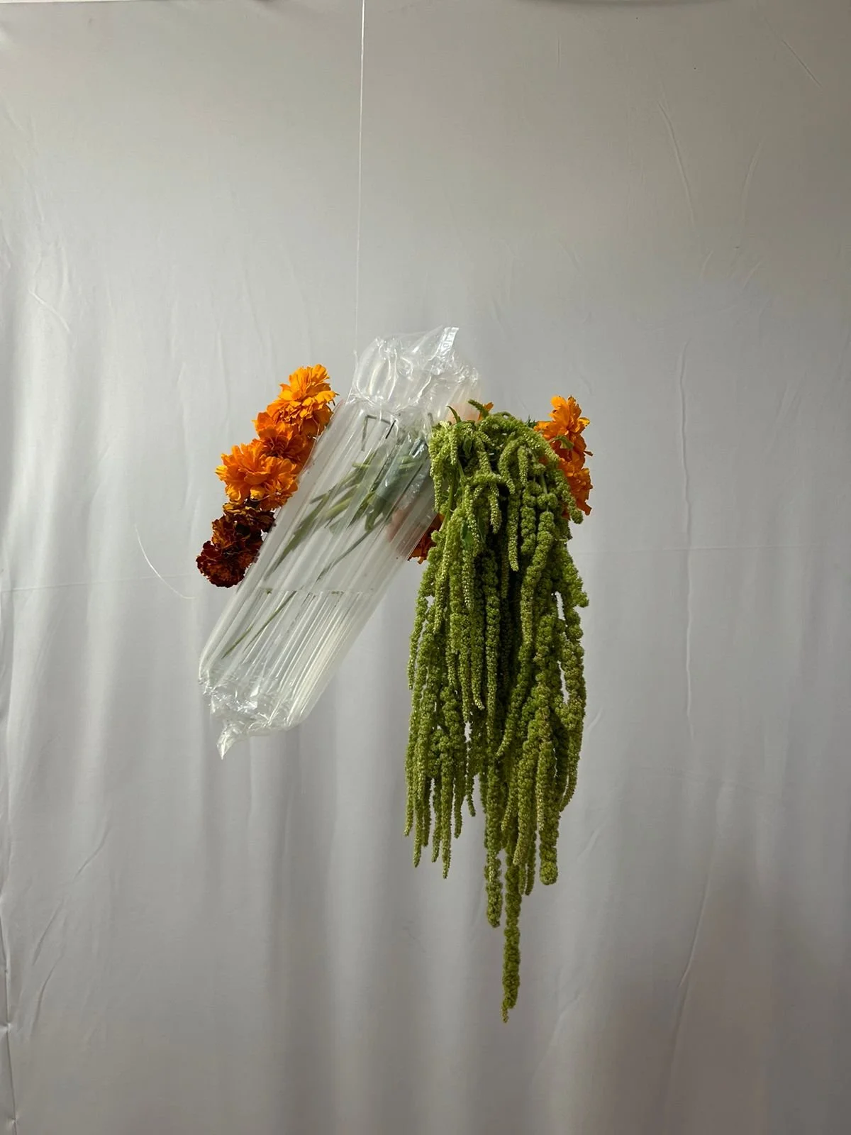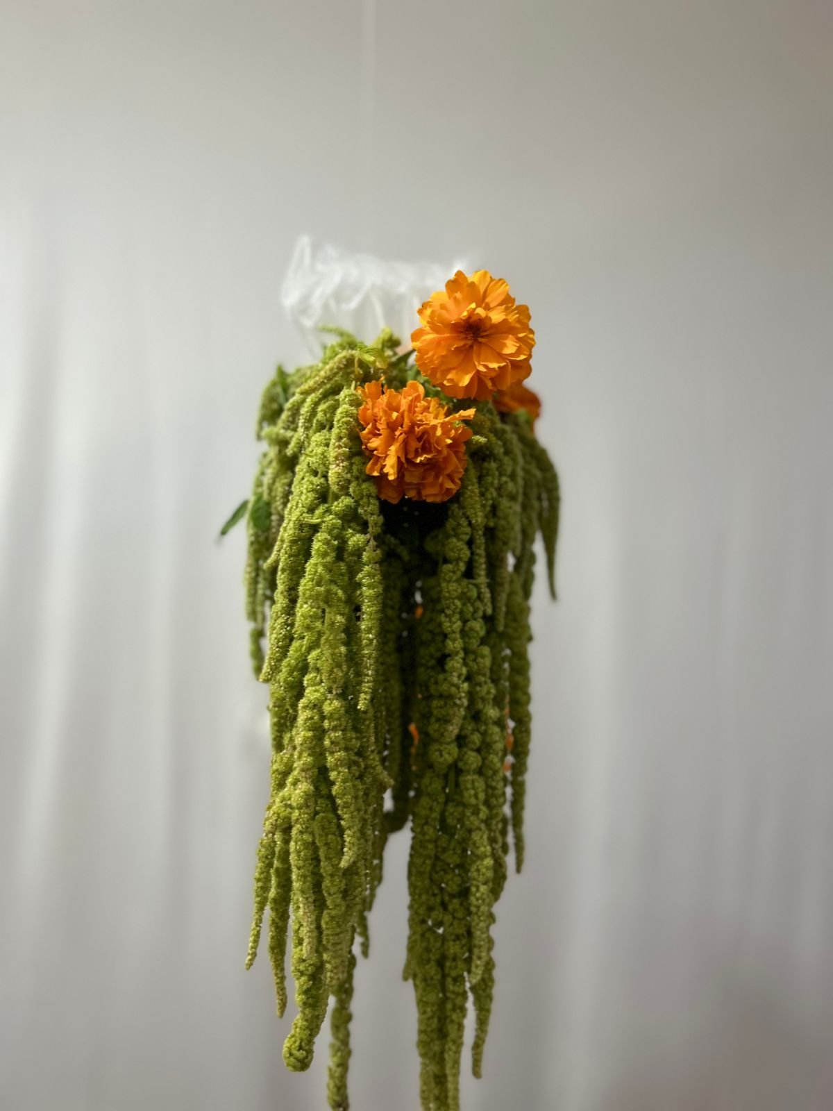 La estructura transparente crea un juego de formas y texturas, mientras las líneas orgánicas del amaranto colgante contrastan con la intensidad cálida de los pétalos.