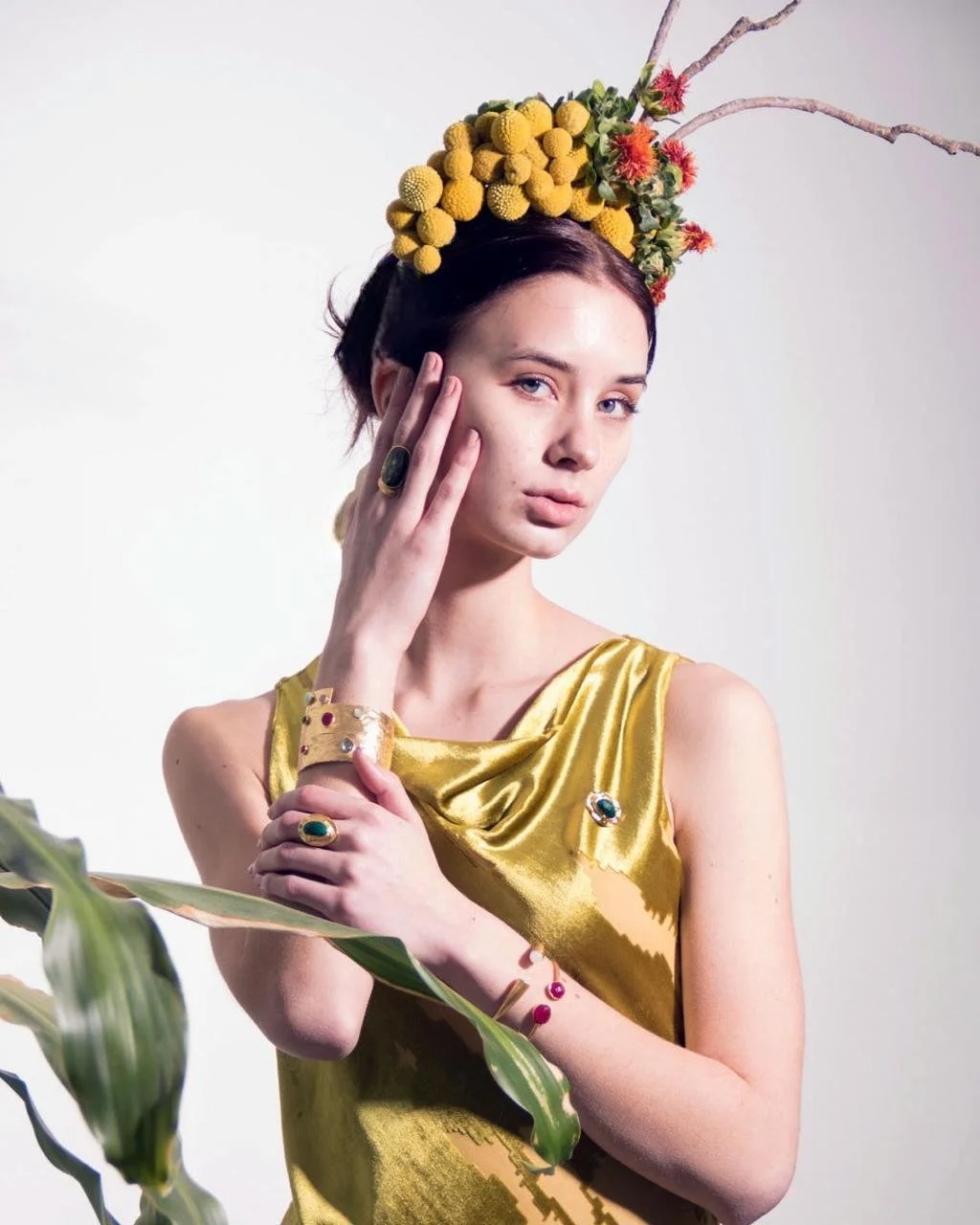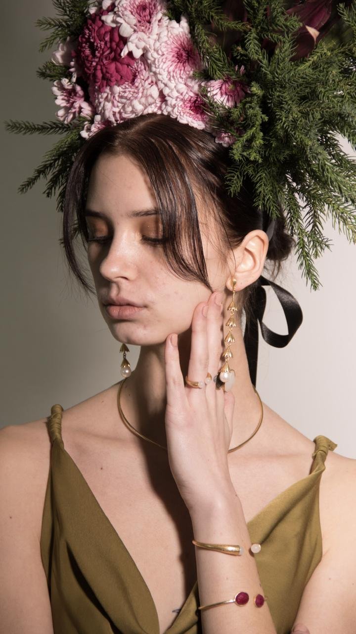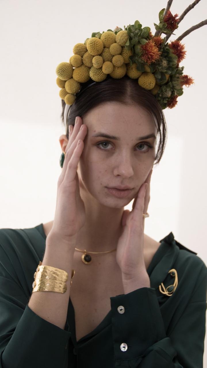 In this collaboration, two forms of artistic expression come together: Mestiza Joyas, showcasing their "Verde Aura" collection inspired by the bark of trees, its irregularity, unique character, and deep cultural roots, and the contemporary floral art of Ceci Bordás, transforming ideas into vibrant, living creations.
